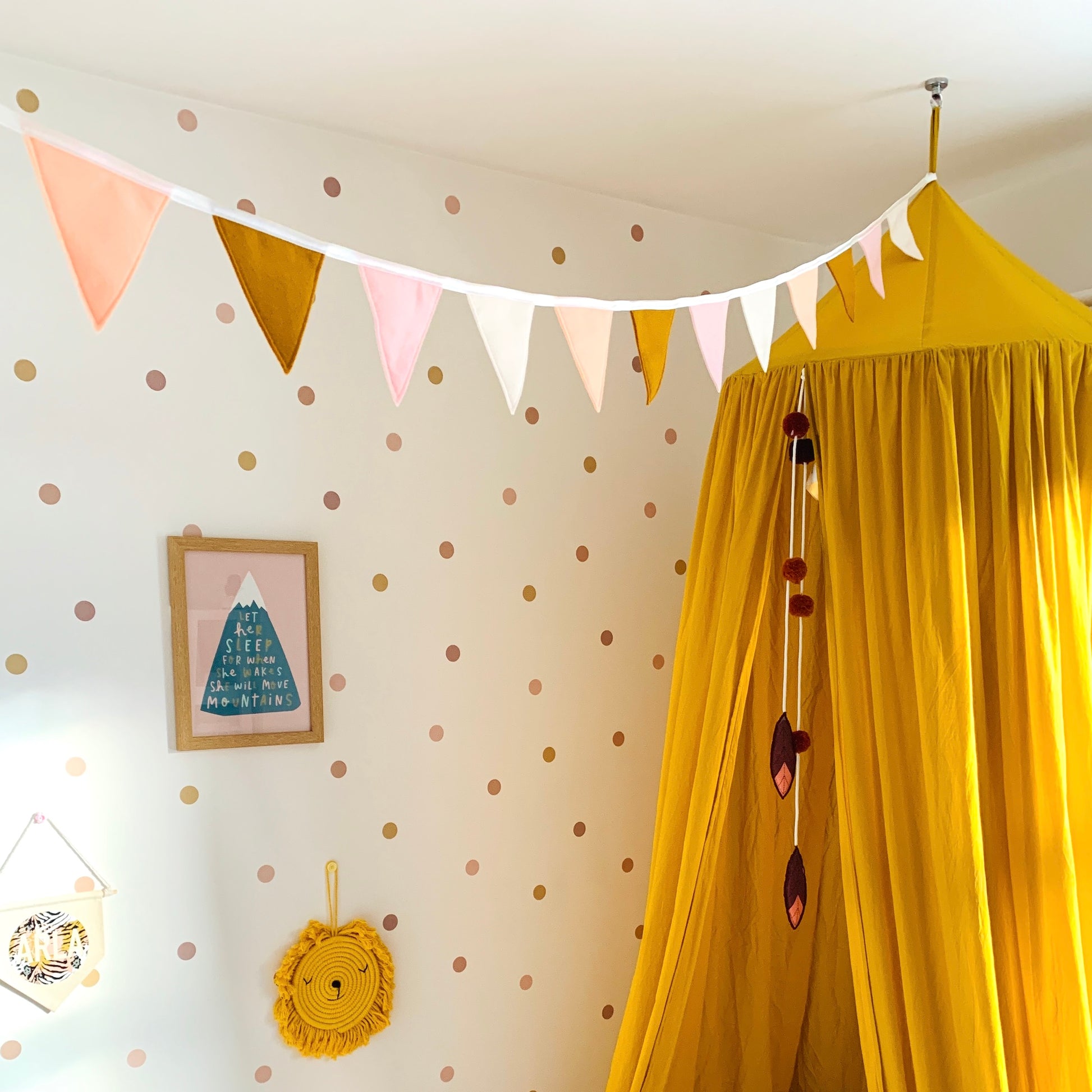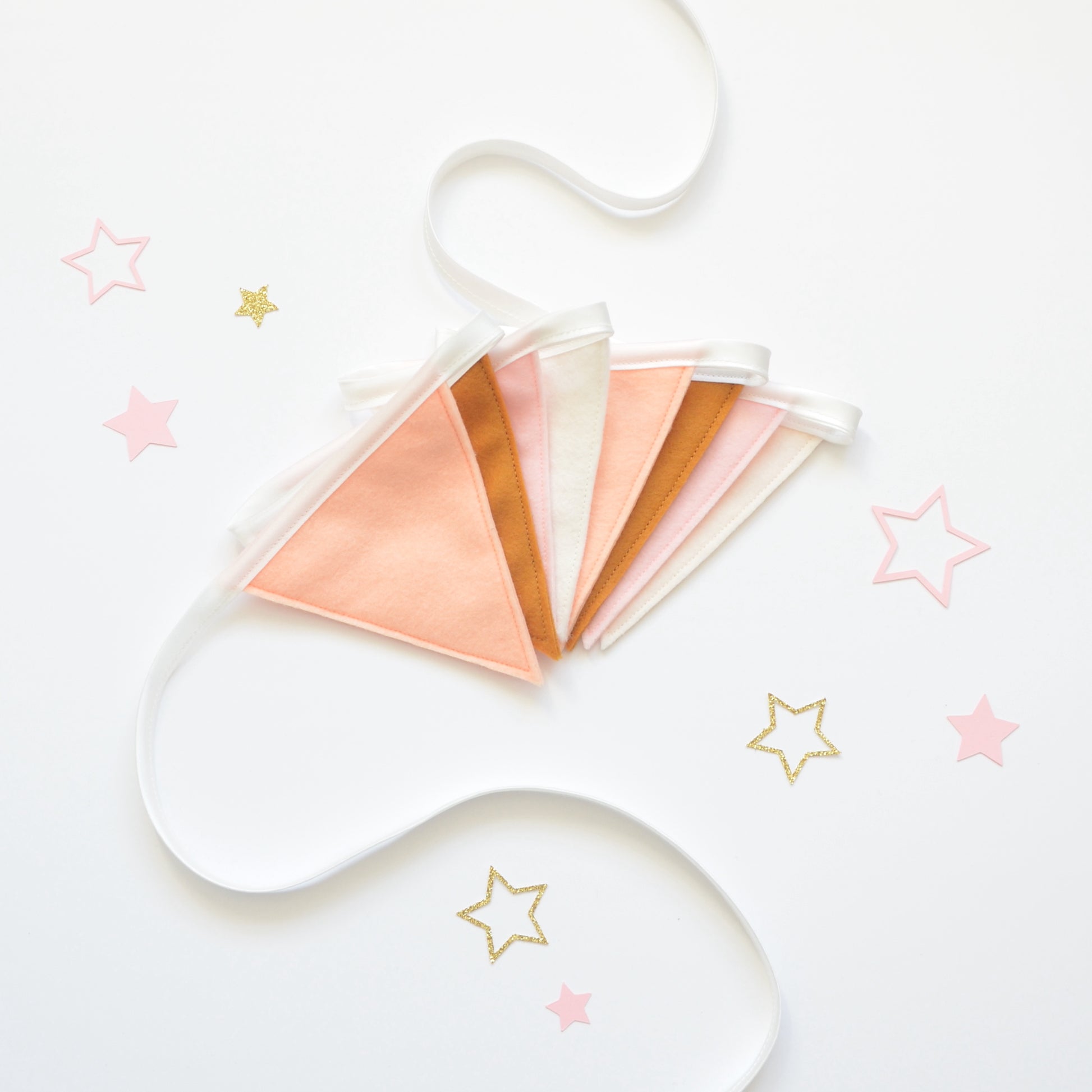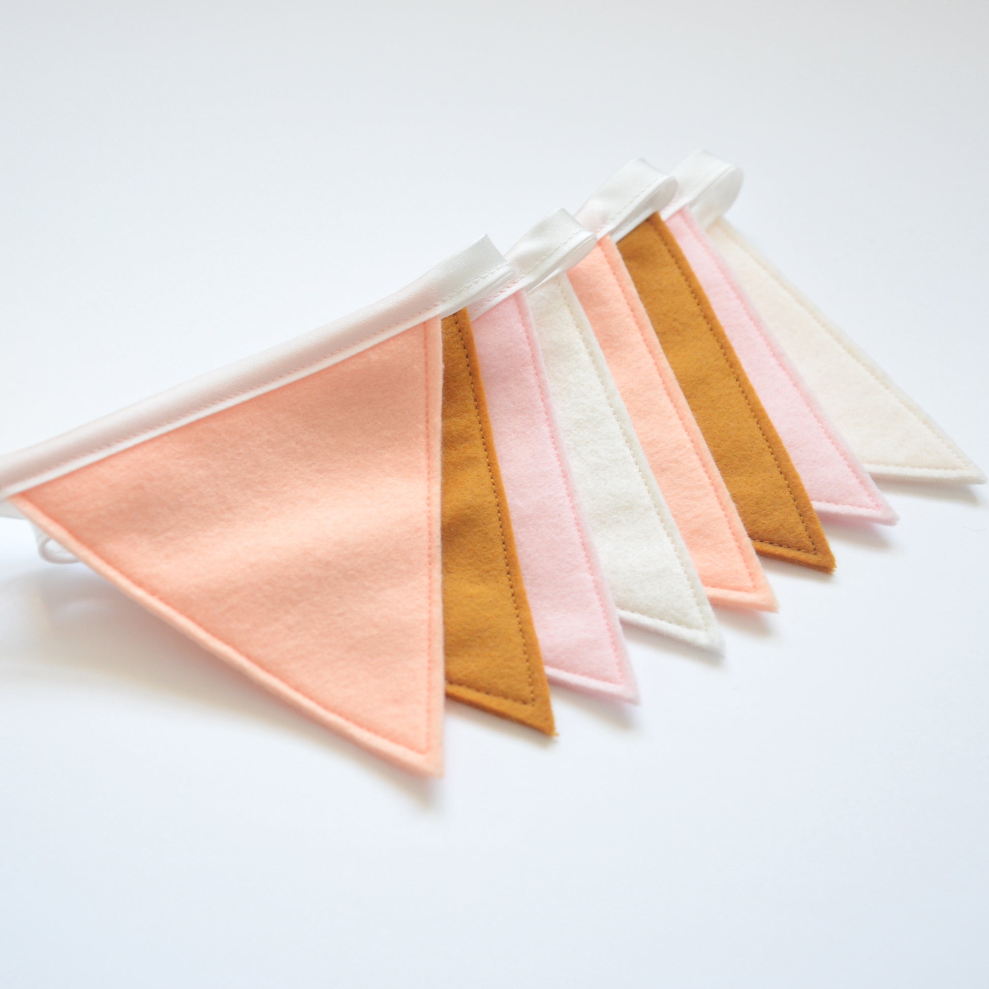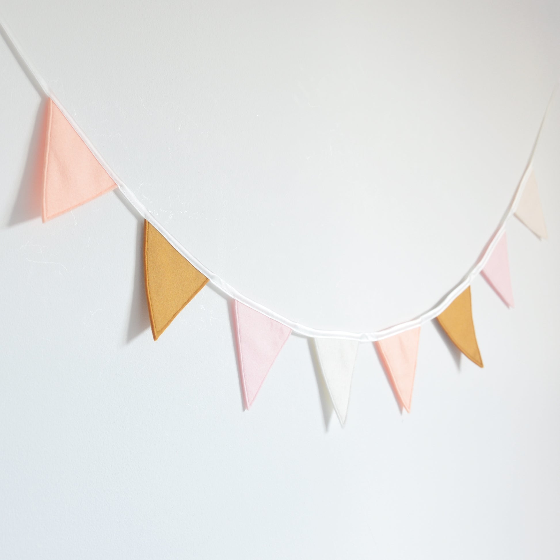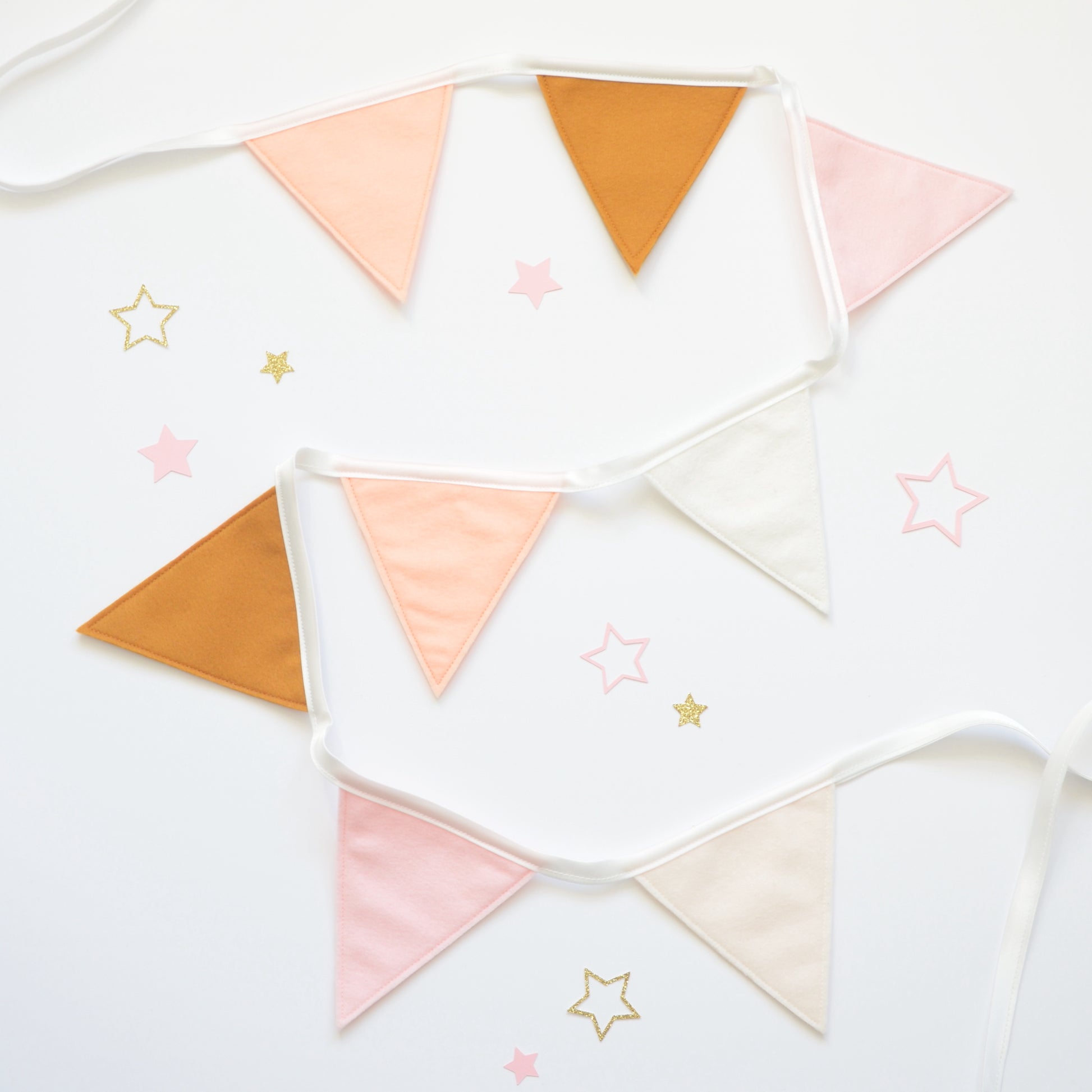 If you are looking for a more modern colour combination for a little girl's bedroom - this pink and neutral wall hanging will brighten up even the smallest room. Made up of baby pink, ochre, peach and cream felt flags, this bunting is designed for anyone with a love of scandi decor and would be a great addition to a baby girl's nursery.